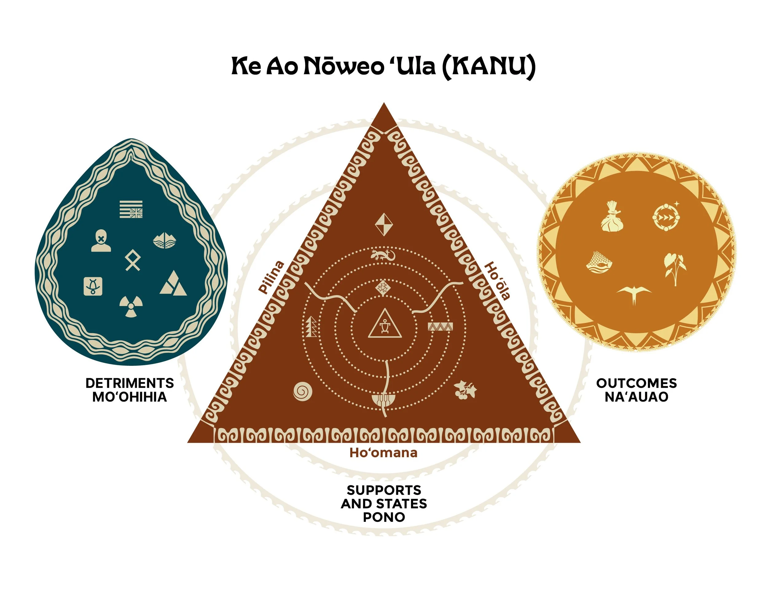 Ke Ao Nōweo 'Ula means “the new dawn that shines bright,” a decolonial theory of wellbeing, for Kānaka ʻŌiwi in behavioral health contexts. The name honors coming out of darkness and into ao - dawn, enlightenment. The acronym form is KANU, meaning both plant and hereditary, emphasizing the relational, cyclical, intergenerational ecology of mauli ola processes.
